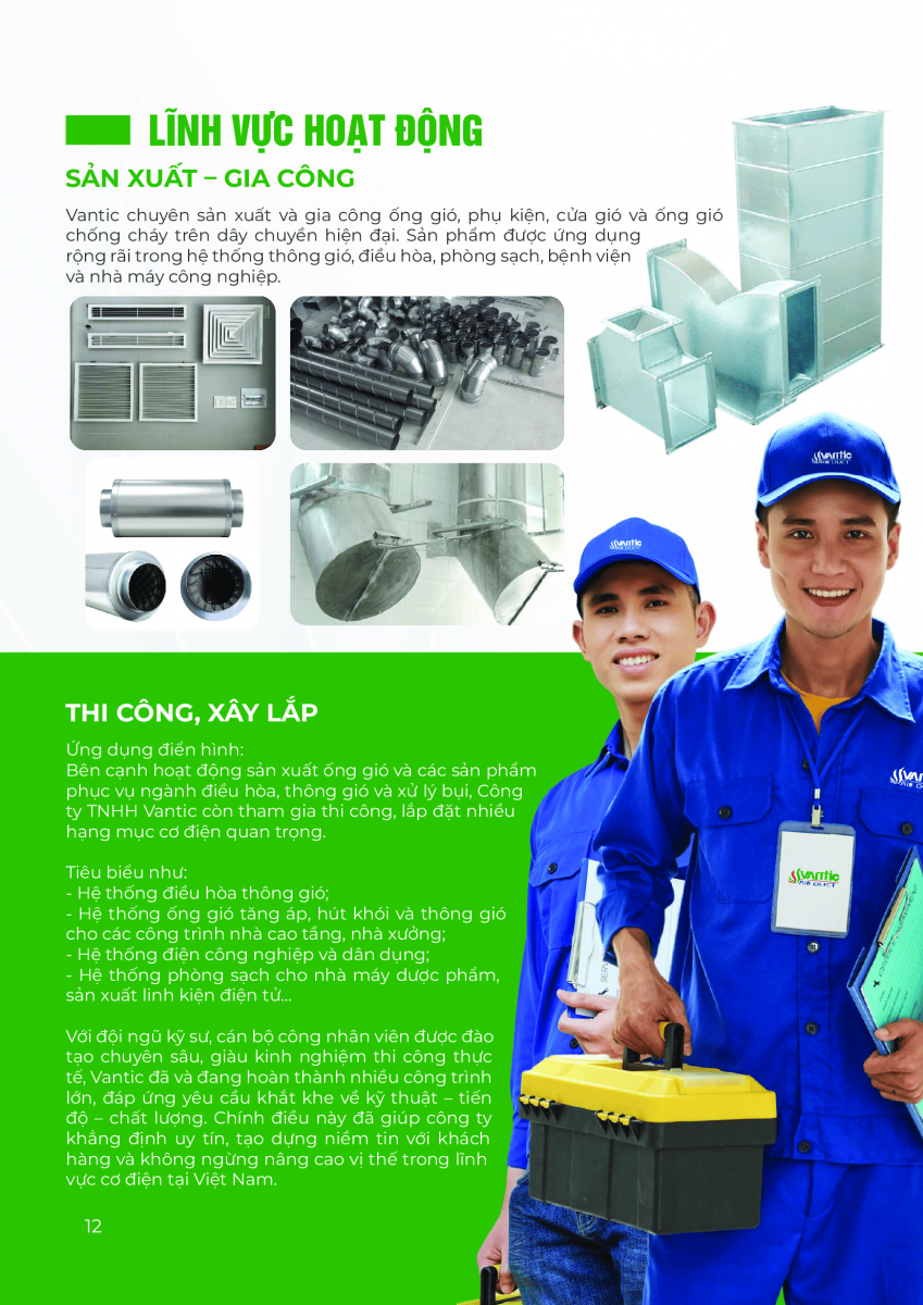 Hệ thống thông gió – điều hòa, hệ thống điện công nghiệp & dân dụng, hệ thống phòng cháy chữa cháy. Sản xuất – gia công: